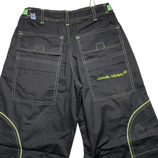 Criminal Damage Cargo Parachute Baggy Combat Trousers Black and Green Contrast Stitch (M)