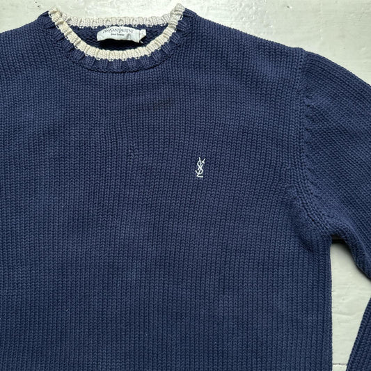 YSL Yves Saint Laurent Vintage Navy and White Cable Knit Knitted Thick Jumper